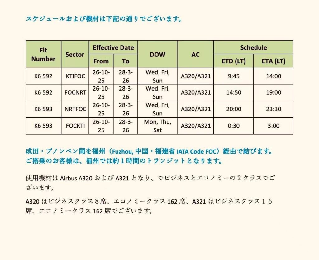 - ルート:プノンペン ⇄ 福州 ⇄ 東京(成田)